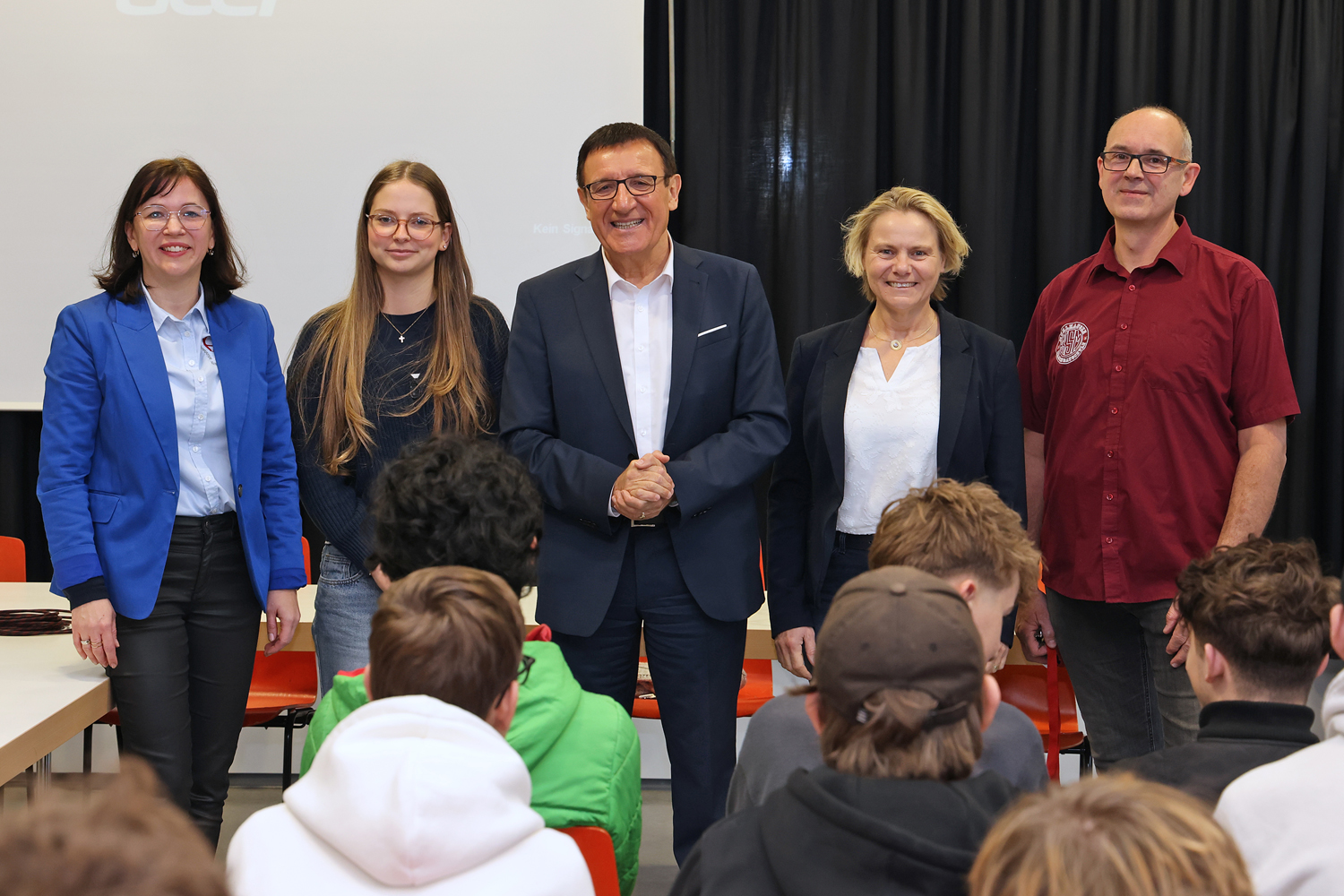 Von links nach rechts: Konrektorin Claudia Botz, Schülersprecherin Julianna Krizsan, Landtagsvizepräsident Wolfgang Reinhart MdL, Christiane Staab MdL und Rektor Holger Menges. (Foto: Busse)Reinhart, der seinen beruflichen Weg über Schule, Jurastudium und die Gründung einer Anwaltskanzlei mit heute rund 100 Mitarbeitern bis ins Landesparlament beschrieb, nahm die Jugendlichen mit in seinen Alltag als Vizepräsident. Dabei erklärte er anschaulich, wie Debatten geführt, Gesetze beraten und Plenarsitzungen geleitet werden. „Man muss dabei genauso aufmerksam sein wie ein Lehrer im Unterricht“, sagte er mit einem Augenzwinkern und würdigte direkt im Anschluss den Einsatz der Lehrkräfte: „Lehrer leisten Wertvolles für Euch und unsere Gesellschaft.“