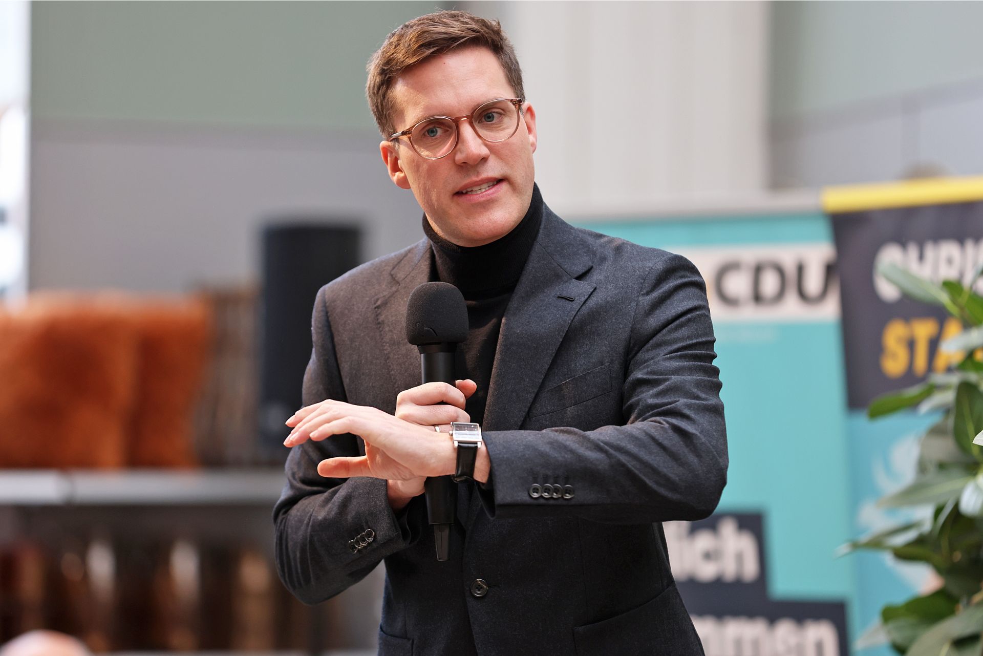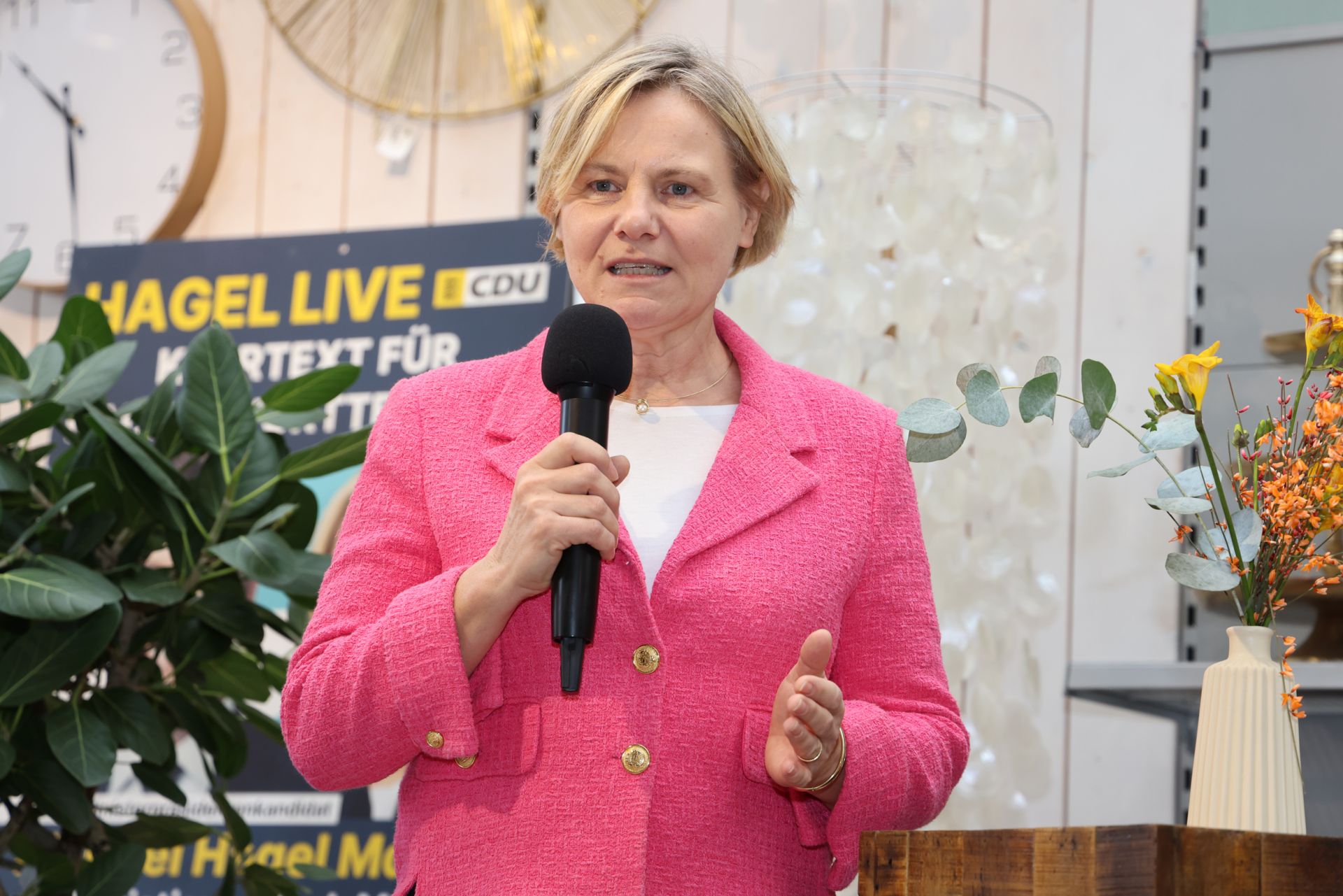Im Anschluss lieferte Hagel in einer rund 50-minütigen Rede und auf einer kleinen, schön gestalteten Bühne nah am Publikum das, was angekündigt war: Klartext zu den zentralen landespolitischen Zukunftsthemen Wirtschaft, Bildung und Innere Sicherheit. Immer wieder wurde er von kräftigem Applaus unterbrochen. Wirtschaftlich müsse Baden-Württemberg raus aus der Wachstumsflaute. Nach dem Wahltag, dem 8. März, müsse im Mittelpunkt stehen: „Wirtschaft, Wirtschaft, Wirtschaft.“ Es gehe nicht darum, Wohlstand zu verteilen, sondern neuen zu schaffen. Hagel sprach sich gegen Verbote aus und für technologische Offenheit, gerade mit Blick auf die Automobilindustrie. Entscheidend sei, dass Wertschöpfung im „Ländle“ bleibe. Zugleich zeigte er Perspektiven auf: neue Arbeitsplätze in Zukunftsbranchen wie Künstliche Intelligenz, Biotechnologie oder Verteidigungstechnologie.